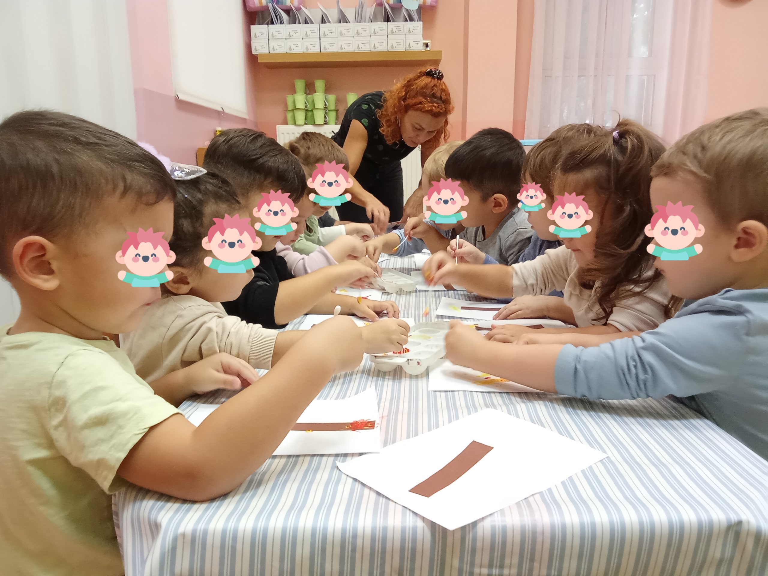 Φτιάξαμε φύλλα, με μπατονέτες και τέμπερα σε κίτρινο και κόκκινο χρώμα προσθέσαμε βουλίτσες στα κλαδιά του δέντρου και λίγα φύλλα να έχουν πέσει στο έδαφος.